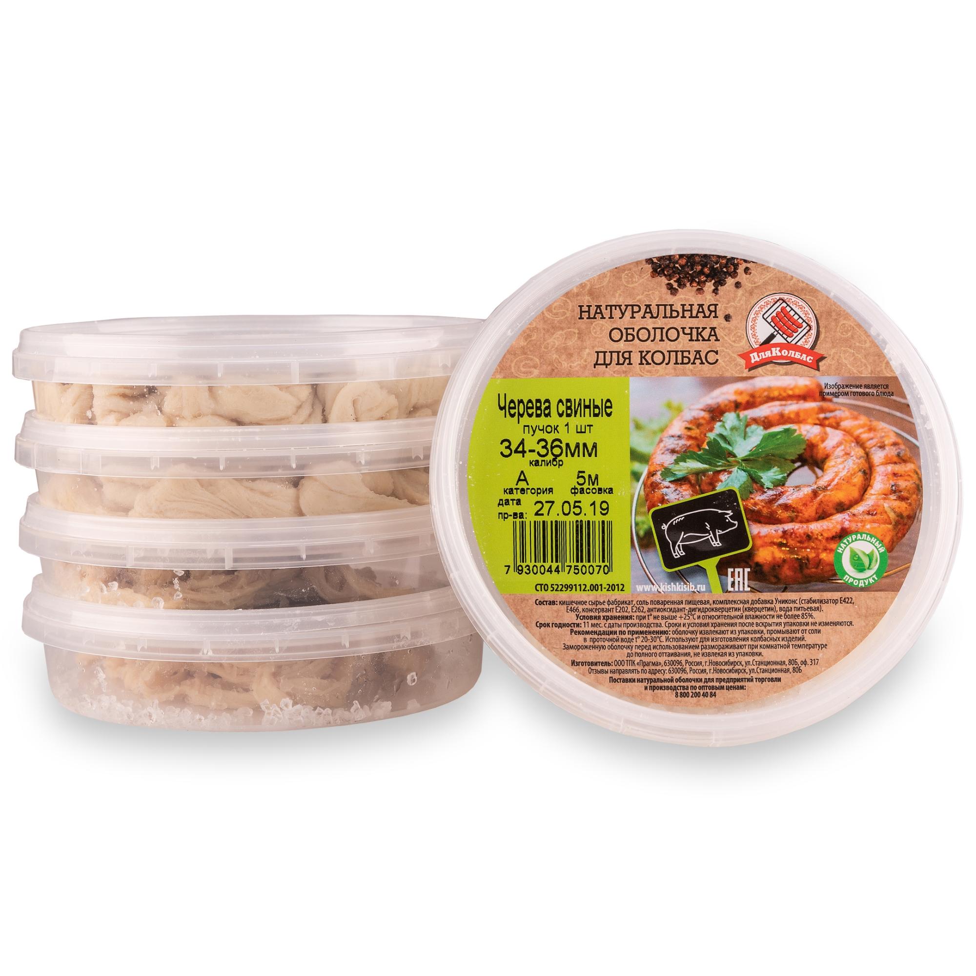 Натуральная оболочка свиная 34-36 мм — самый популярный калибр свиной черевы, отлично подходит для приготовления купат и колбасок для жарки, а так-же копченых и сыровяленых колбас, за счет небольшого диаметра оболочки не требует длительного времени приготовления, а цикл вяления может занимать до двух недель.